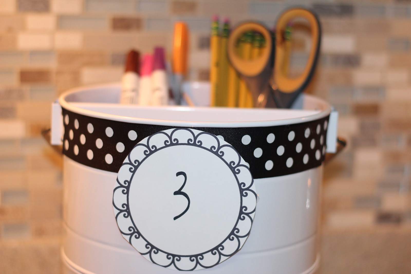 I also fancied up my white pencil buckets from Target. I added some ribbon and the table number. I'm still debating on which label I like better. I have an idea but want your opinion.